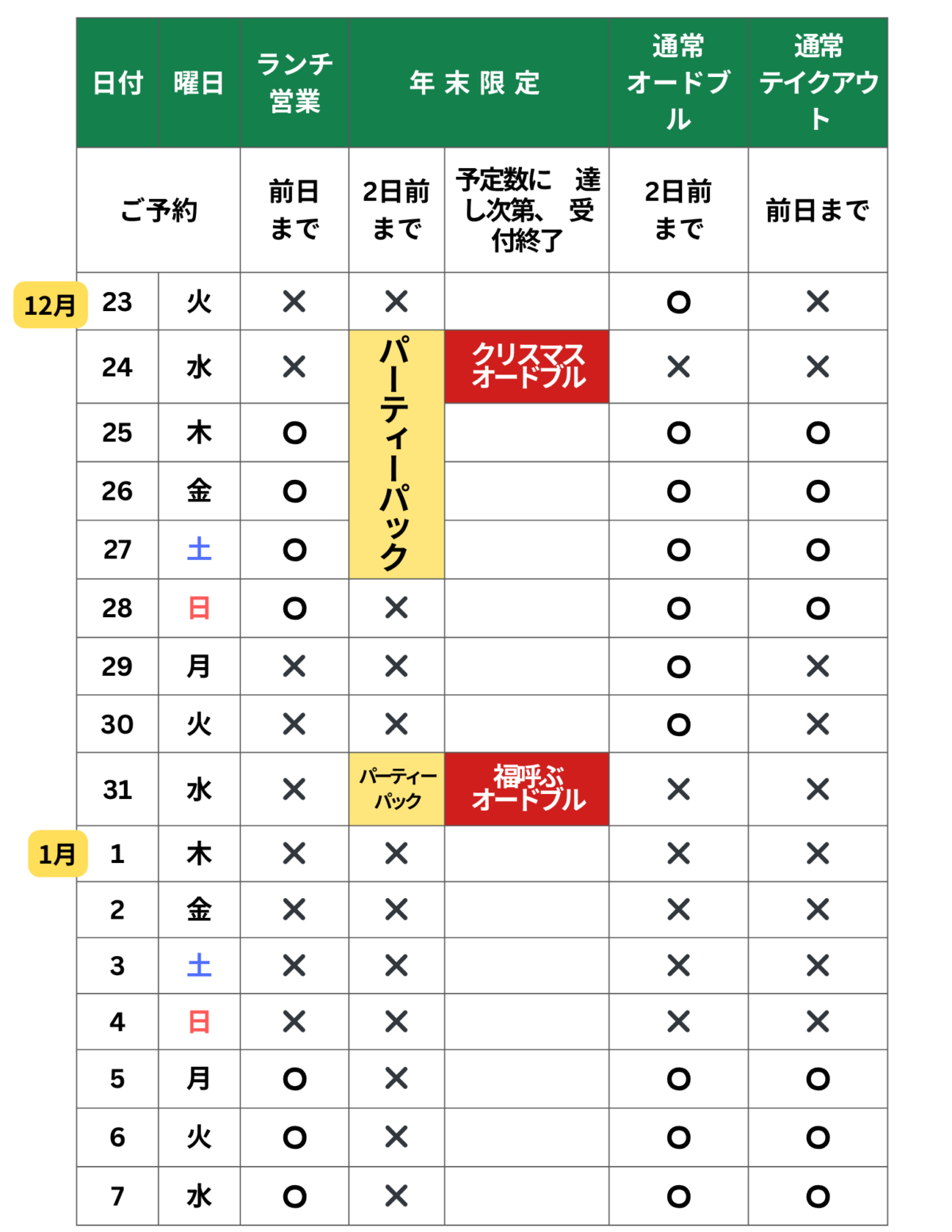 | 1月1日(木) | ✖️ |