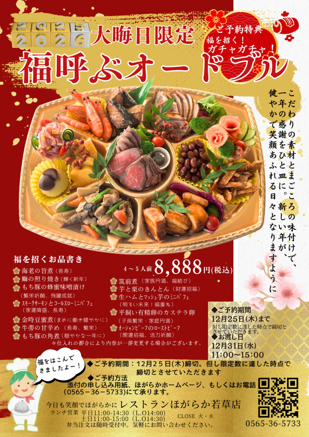今年、レストランほがらか若草店では大晦日の食卓を彩るにふさわしい、特別なオードブルをご用意いたしました。その名も「福呼ぶオードブル」。